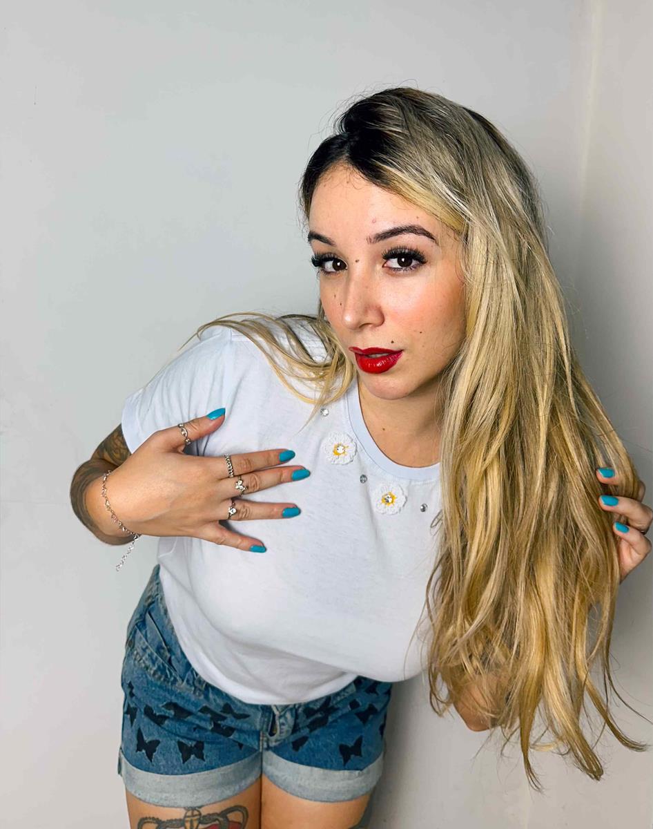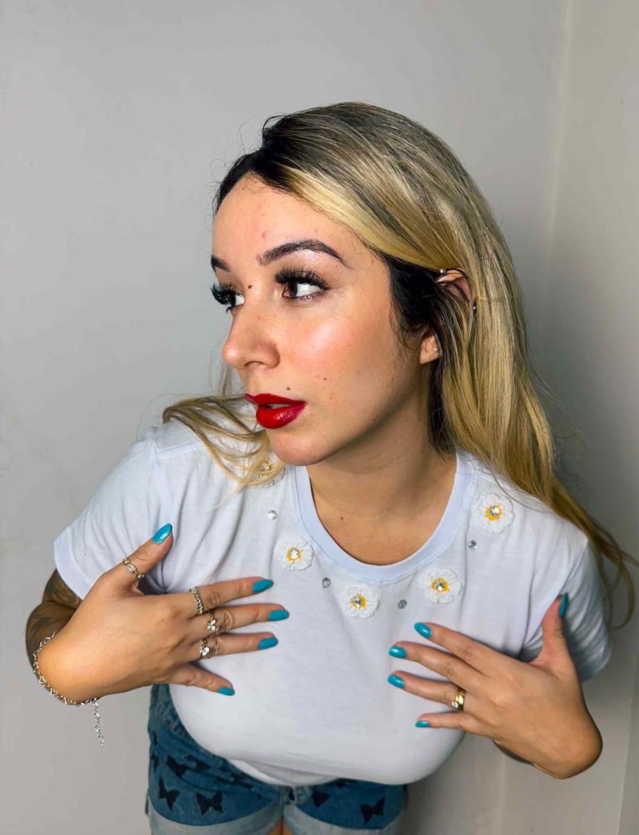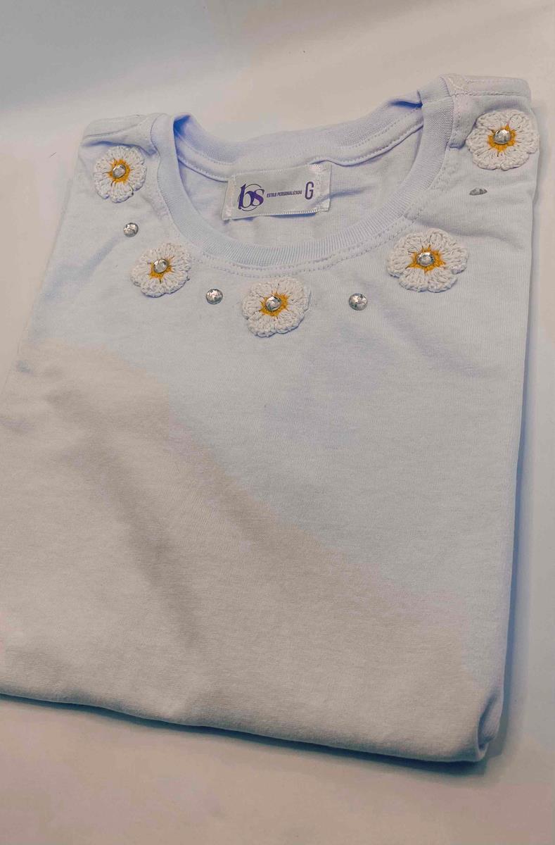 Camiseta 100% algodão, com Bordados Flor Crochê feito á Mão - Exclusivo e Artesanal.